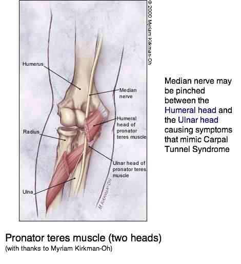 - It is caused by a compression of the median nerve by the pronator teres muscle in the forearm.